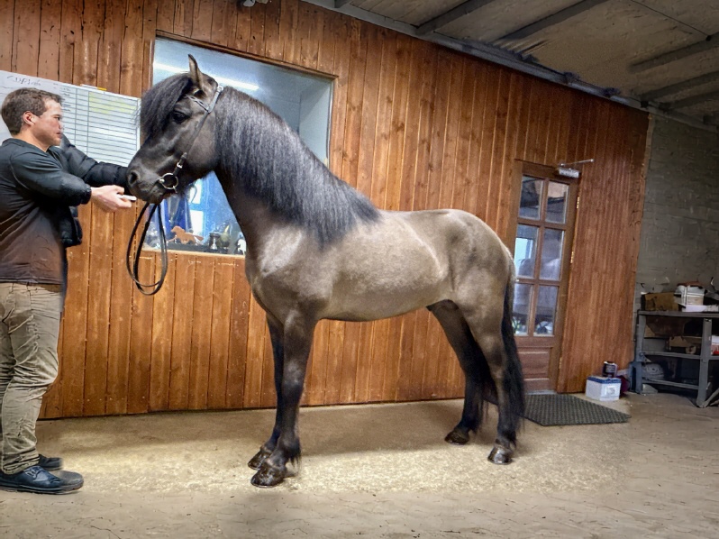 Börkur ist ein knapp 5j Mausfalbhengst, aktuell 145cm gross, aus keinem geringeren als dem bekannten Víðar frá Skör (8.89 - 9.12 = 9.04) und einer Elite Mutter. Er beeindruckte mich sehr als ich ihn erstmals im Herbst 2024 4j bei seinem Züchter zu sehen bekam. Eines der talentiertesten 4j Pferde, die ich je gesehen hatte. Unglaublich hochweites Gangpaket mit viel Lockerheit und Balance spielerisch abrufbar in jeglichem Tempi ist etwas dass mich überzeugte. Jede Gangart eine Sensation inklusive seinem Schritt. Exterieur features die keine Wünsche offen lassen. Starke, elastische Oberlinie sowie traumhaftes Fundament.